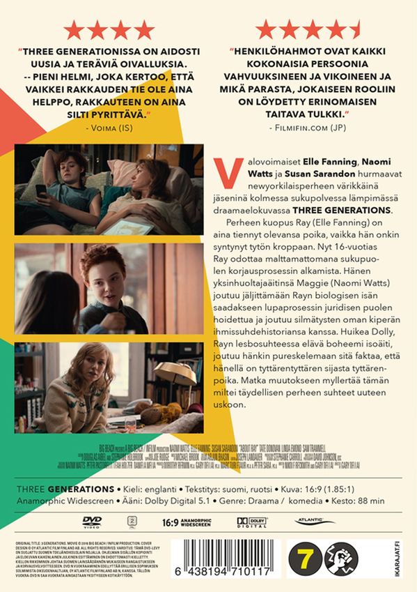 Valovoimaiset Elle Fanning, Naomi Watts ja Susan Sarandon hurmaavat newyorkilaisperheen värikkäinä jäseninä kolmessa sukupolvessa lämpimässä draamaelokuvassa THREE GENERATIONS. Perheen kuopus Ray (Elle Fanning) on aina tiennyt olevansa poika, vaikka hän onkin syntynyt tytön kroppaan. Nyt 16-vuotias Ray odottaa malttamattomana sukupuolen korjausprosessin alkamista. Hänen yksinhuoltajaäitinsä Maggie (Naomi Watts) joutuu jäljittämään Rayn biologisen isän saadakseen lupaprosessin juridisen puolen hoidettua ja joutuu silmätysten oman kiperän ihmissuhdehistoriansa kanssa. Huikea Dolly, Rayn lesbosuhteessa elävä boheemi isoäiti, joutuu hänkin pureskelemaan sitä faktaa, että hänellä on tyttärentyttären sijasta tyttärenpoika. Matka muutokseen myllertää tämän miltei täydellisen perheen suhteet uuteen uskoon.