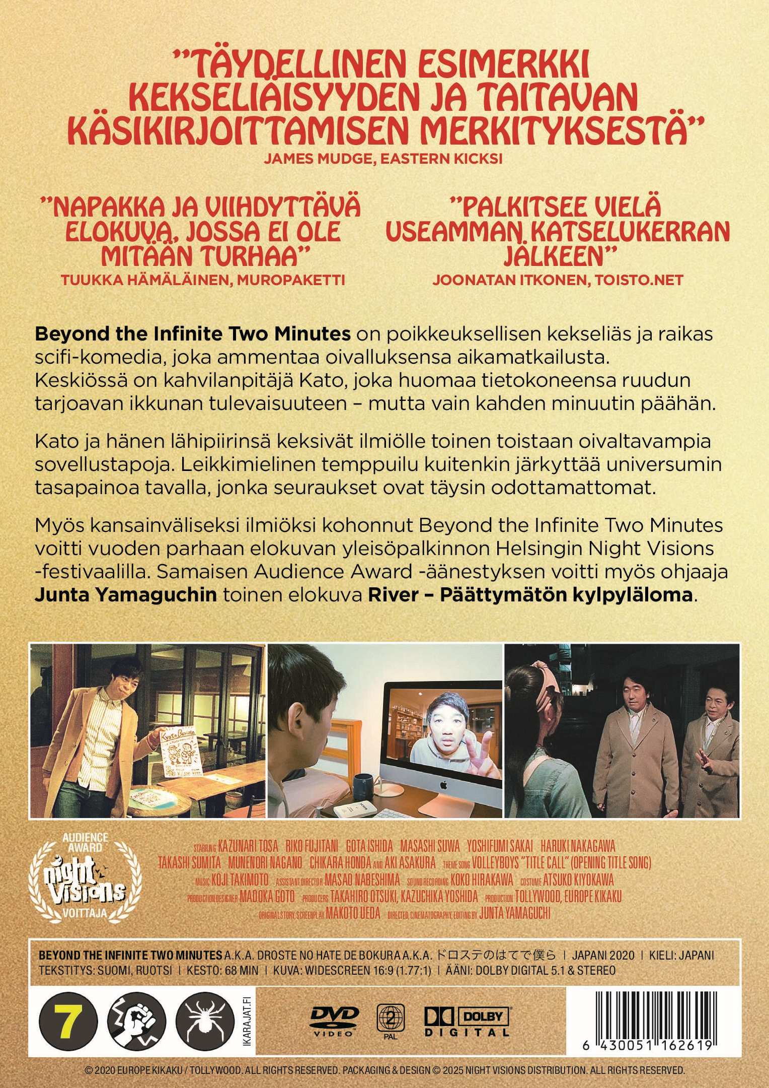Myös kansainväliseksi ilmiöksi kohonnut Beyond the Infinite Two Minutes voitti vuoden parhaan elokuvan yleisöpalkinnon Helsingin Night Visions -festivaalilla. Samaisen Audience Award -äänestyksen voitti myös ohjaaja Junta Yamaguchin toinen elokuva River – Päättymätön kylpyläloma.