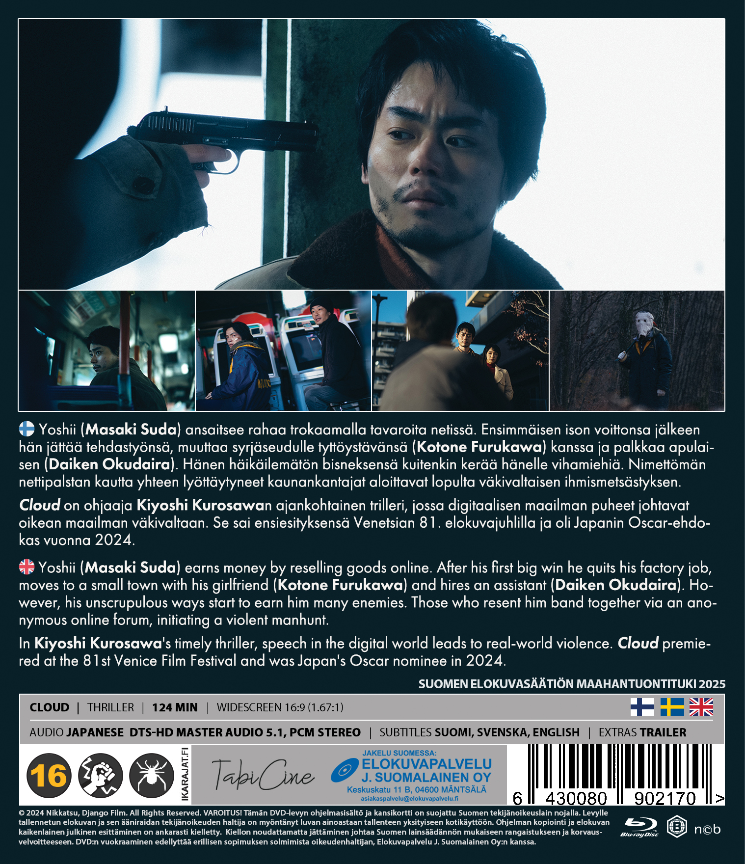 ”Cloud” on ohjaaja Kiyoshi Kurosawan ajankohtainen trilleri, jossa nettimaailman puheet johtavat väkivallantekoihin oikeassa maailmassa. ”Cloud” oli myös Japanin vuoden 2024 Oscar-ehdokas.
