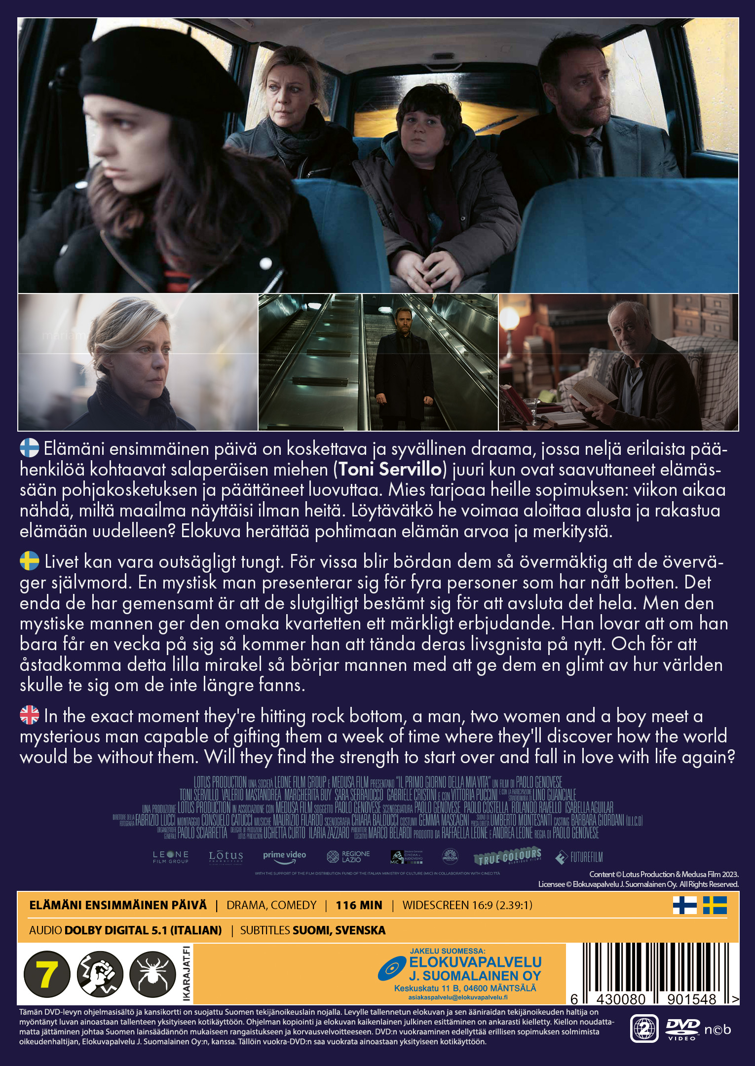 ”Elämäni ensimmäinen päivä” on koskettava ja syvällinen draama, jossa neljä keskenään erilaista päähenkilöä Napoleone (Valerio Mastandrea), Arianna (Margherita Buy), Emilia (Sara Serraiocco) ja Daniele (Gabriele Cristini) kohtaa salaperäisen miehen (Toni Servillo) juuri kun he ovat saavuttaneet elämässään pohjakosketuksen ja päättäneet luovuttaa. Mies tarjoaa heille sopimuksen: viikon aikaa nähdä, miltä maailma näyttäisi ilman heitä. Löytävätkö he voimaa aloittaa alusta ja rakastua elämään uudelleen? Elokuva herättää pohtimaan elämän arvoa ja merkitystä.
