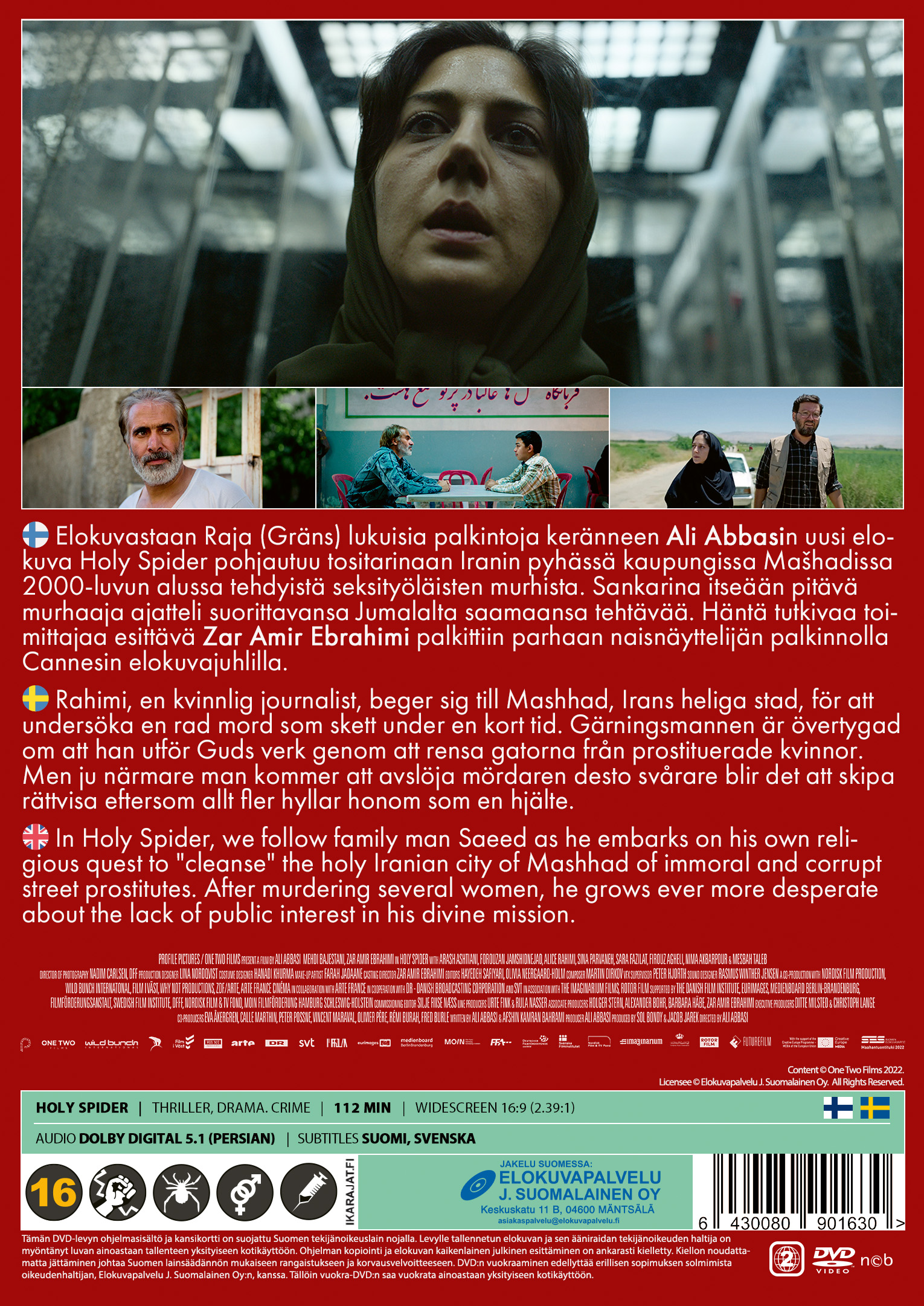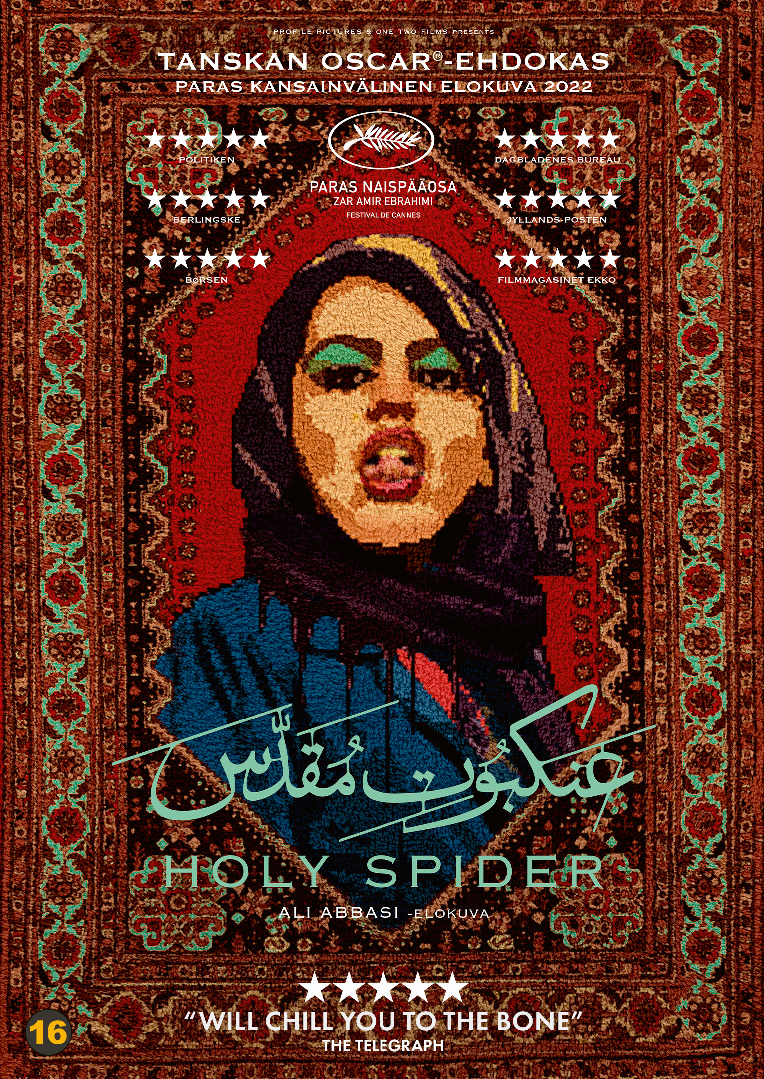 Elokuvastaan ”Raja” (Gräns) lukuisia palkintoja keränneen Ali Abbasin uusi elokuva ”Holy Spider” pohjautuu tositarinaan Iranin pyhässä kaupungissa Mašhadissa 2000-luvun alussa tehdyistä seksityöläisten murhista. Sankarina itseään pitävä murhaaja ajatteli suorittavansa Jumalalta saamaansa tehtävää. Häntä tutkivaa toimittajaa esittävä Zar Amir Ebrahimi palkittiin parhaan naisnäyttelijän palkinnolla Cannesin elokuvajuhlilla.