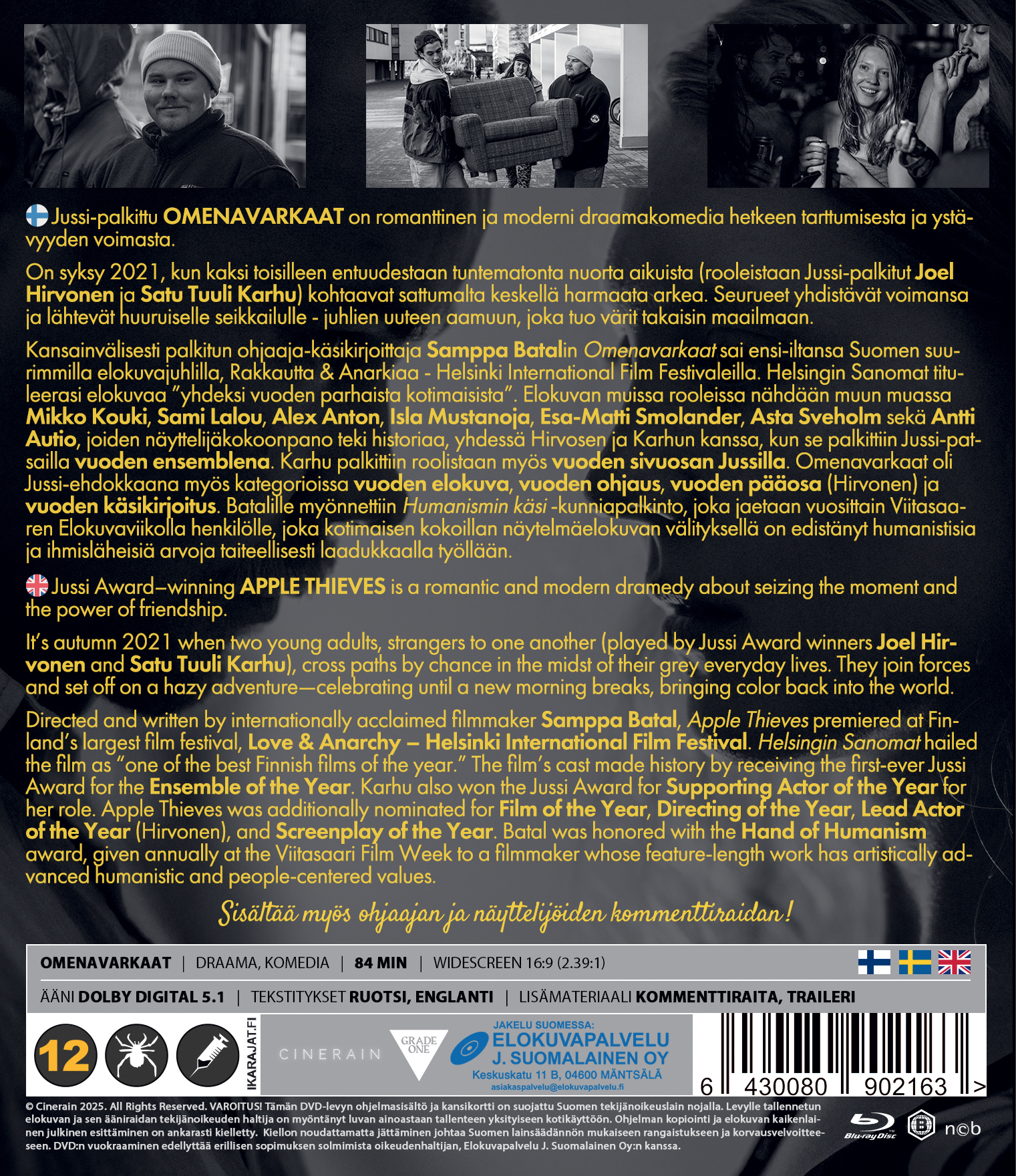 Suomen suurimmilla elokuvajuhlilla, Rakkautta & Anarkiaa – Helsinki International Film Festivaleilla maailmanensi-iltansa saanut ja täydet salit hurmannut “Omenavarkaat” on romanttinen ja moderni draamakomedia hetkeen tarttumisesta, nuorista aikuisista sekä ystävyyden voimasta.