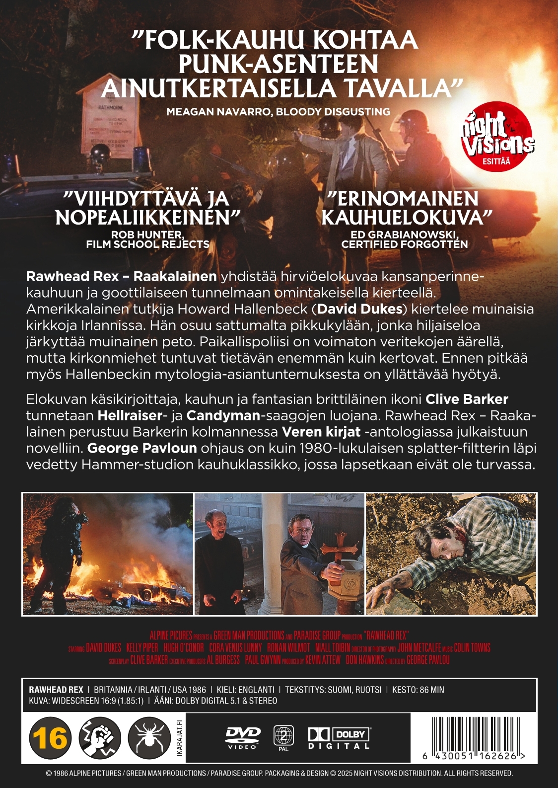 Elokuvan käsikirjoittaja, kauhun ja fantasian brittiläinen ikoni Clive Barker tunnetaan Hellraiser- ja Candyman-saagojen luojana. Rawhead Rex – Raakalainen perustuu Barkerin kolmannessa Veren kirjat -antologiassa julkaistuun novelliin. George Pavloun ohjaus on kuin 1980-lukulaisen splatter-filtterin läpi vedetty Hammer-studion kauhuklassikko, jossa lapsetkaan eivät ole turvassa.
